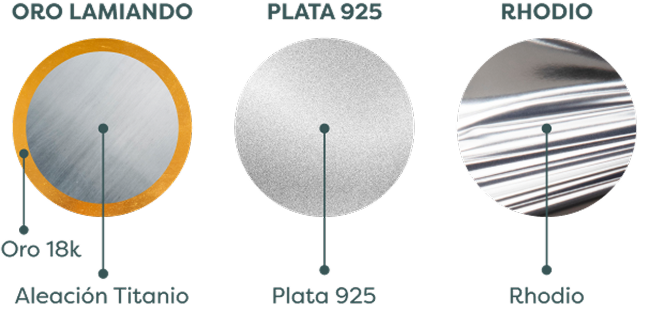 Cada una de nuestras piezas es elaborada con altos estándares de calidad. La base de nuestras joyas es una aleación de metales con su respectivo baño en plata o baño de oro dependiendo el color que escojas. Adicionalmente todos nuestros productos cuentan con un recubrimiento de laca cataforética para mayor protección.